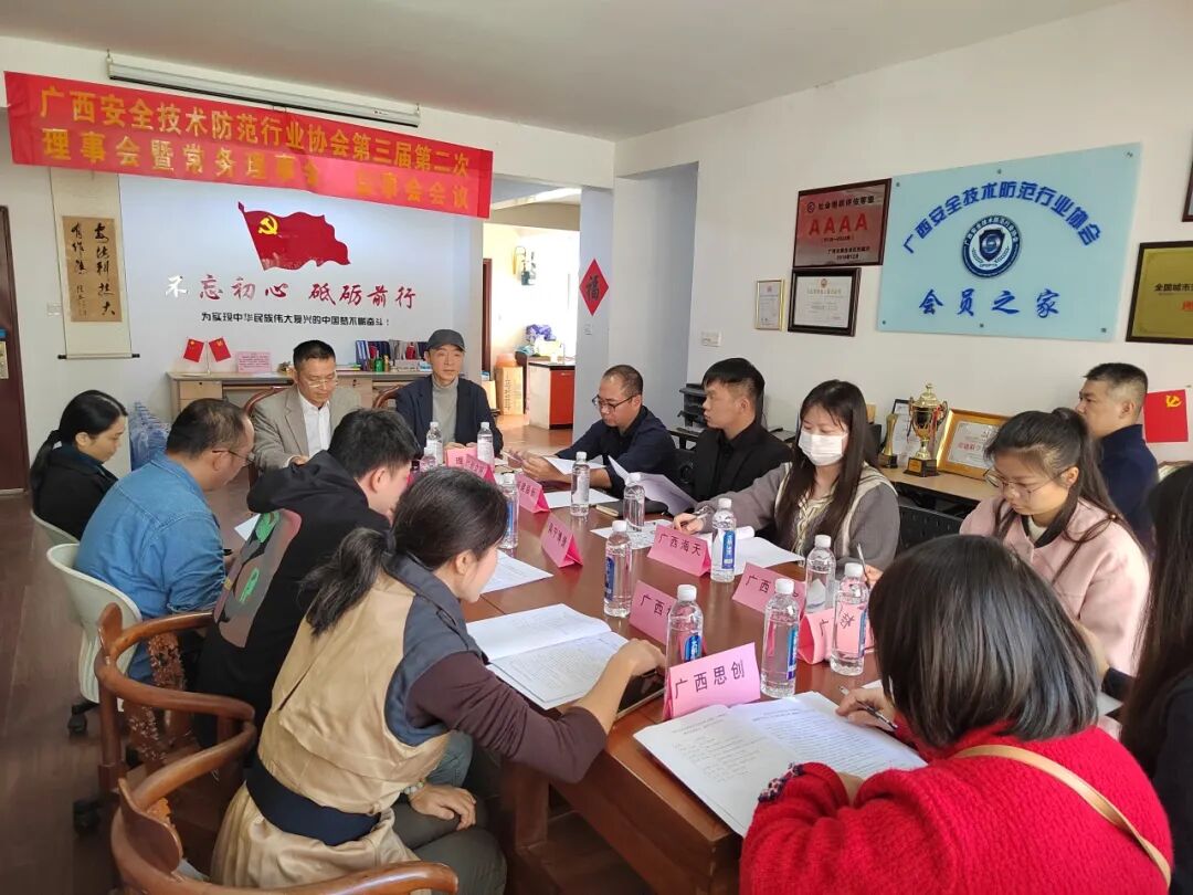 2025年12月18日下午,广西安防协会第三届第二次理事会暨常务理事会、监事会会议在协会会议室召开,协会党支部、副理事长单位、常务理事的那位、监事单位代表共24人出席会议,参会企业代表超过理事会2/3,符合开会要求。